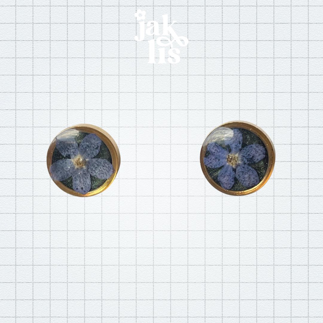 w kształcie koła zatopione zostały niebieskie kwiaty niezapominajki na czarnym połyskującym tle